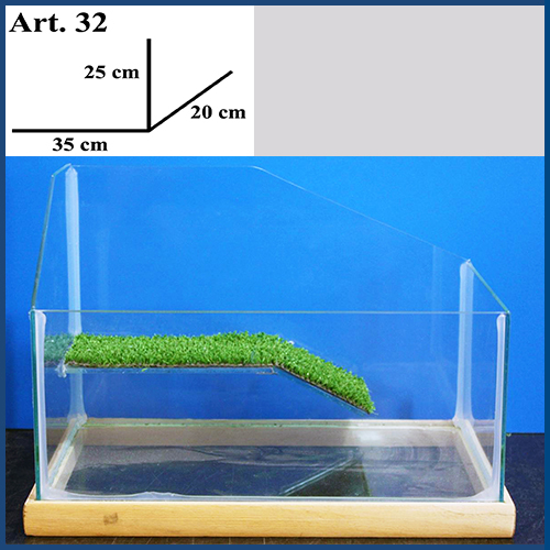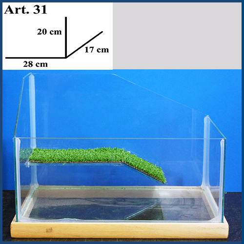 Tartarughiera a forma rettangolare in vetro fatta a mano, senza coperchio, con penisola in vetro rivestita con prato in erba sintetica. Impermeabile adatta per contenere sia liquidi che materiale secco. Nella base e sulla parte superiore la cornic...