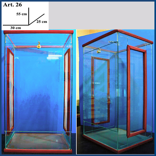 Terrario in vetro fatto a mano, con apertura sul davanti e chiave con serratura. Su ogni lato del terrario c'è la presa d'aria con rete. Alla base e sulla parte superiore la cornice è in legno. DIMENSIONI: L 25 x H 45 x P 2...